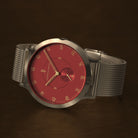 - Diseño icónico: Esfera roja mate, caja dorada cepillada de 42,5 mm con corona integrada y correa intercambiable — donde el estilo se une a la funcionalidad.