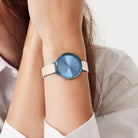 • Elegancia celestial: El acabado cepillado de la caja de 30 mm y la esfera con efecto de rayos de sol le dan al look tono sobre tono una frescura incomparable.
