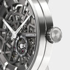 • Precision made visible: The skeletonized dial unveils the complex aesthetics of the automatic movement.